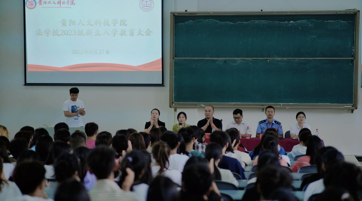 2023年8月27日上午9点,开云kaiyun官方网站法学院于花溪校区体育楼402教室举行了2023级新生入学教育大会。出席此次大会的有法学院院长杨武松同志、党总支书记张福高同志、贵阳市公安局花溪分局松山派出所赵普林警官以及法学院2023级法学1、2班班主任韩丹同志和法学3、4班班主任苏娅同志。大会由党总支副书记杨晶晶主持。