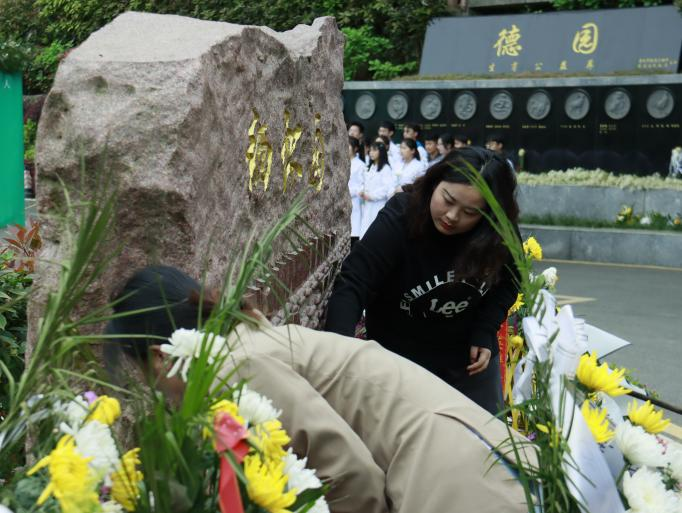 礼毕后,学生第一党支部书记石剑兰同志和学生第四党支部书记刘婷同志擦拭墓碑。