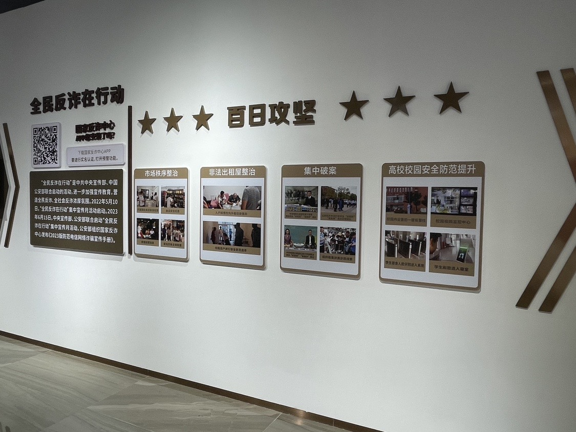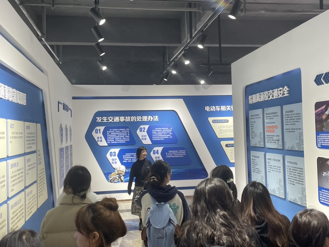 走进基地A区,学习小组成员首先通过图文展板与影像资料,系统了解花溪大学城的发展历程与各级领导的关怀支持。随后,围绕反诈、扫黑除恶、交通安全及消防科普等核心内容,大家在讲解员的带领下,结合真实案例剖析与模拟场景体验,深入学习风险识别方法与应急处置技巧。从电信诈骗话术拆解火灾逃生路线模拟,每一个环节都让成员们直观感受到安全防护的重要性,进一步提升了自身法治素养与风险防范能力。