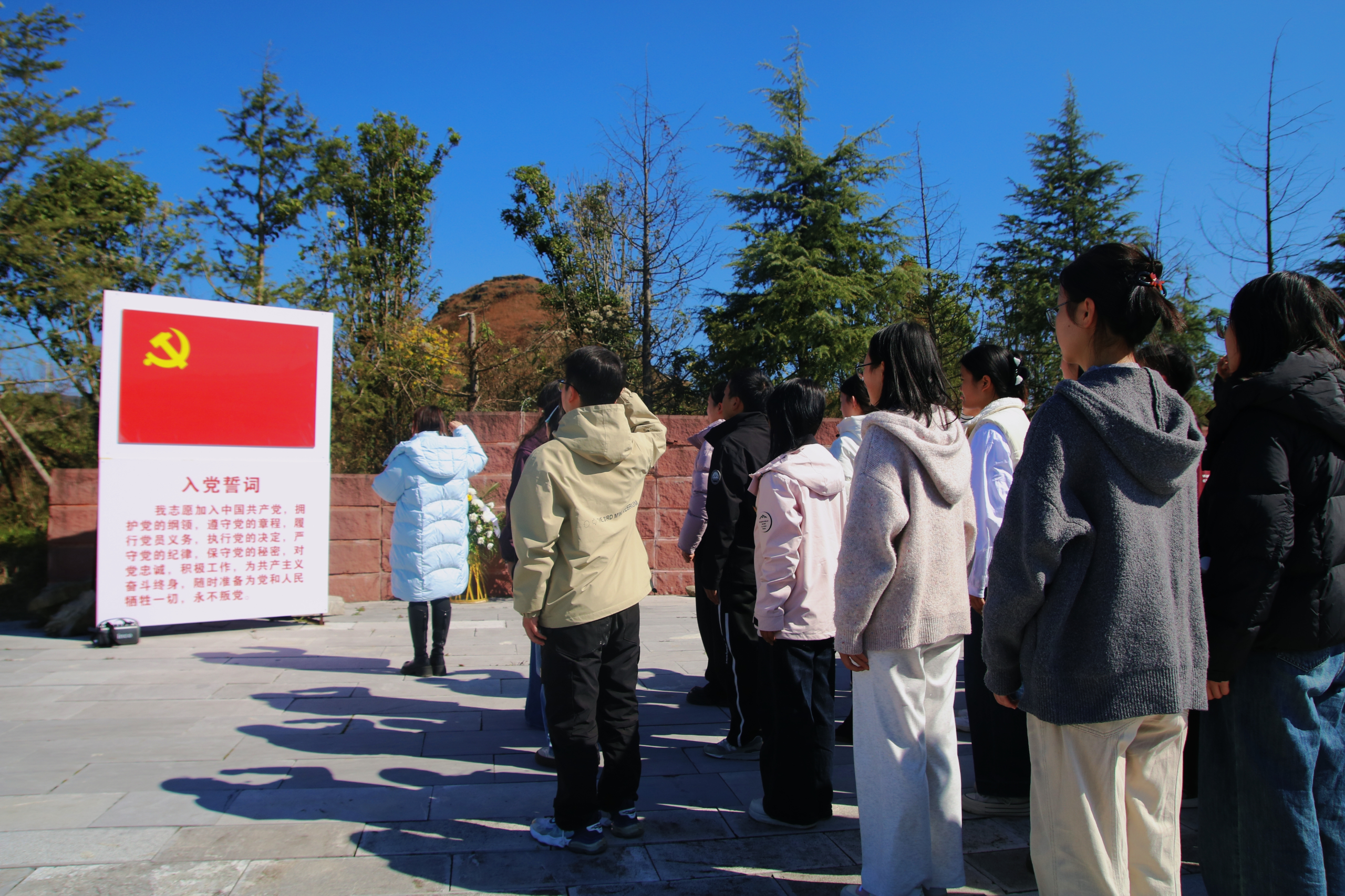 紧接着,前往高坡乡红军居住地广场,在“三双鞋子映初心”的故事中,体会红军与群众的鱼水深情;在拥军坟前,师生们驻足肃立,聆听拥军支前的感人往事,深切缅怀革命先烈。随后,全体人员踏上花溪红军长征历史步道,途经红军桥,在徒步中追寻革命先辈的足迹,切身感受长征路上的艰辛不易。行至步道终点,最后来到红军牺牲地,大家在庄严肃穆的氛围中举行缅怀仪式,面对鲜红的党旗高举右拳,齐声重温入党誓词,铿锵誓言里满是对初心使命的庄严承诺,更彰显着新时代师生党员传承红色精神、勇担时代使命的坚定决心 。