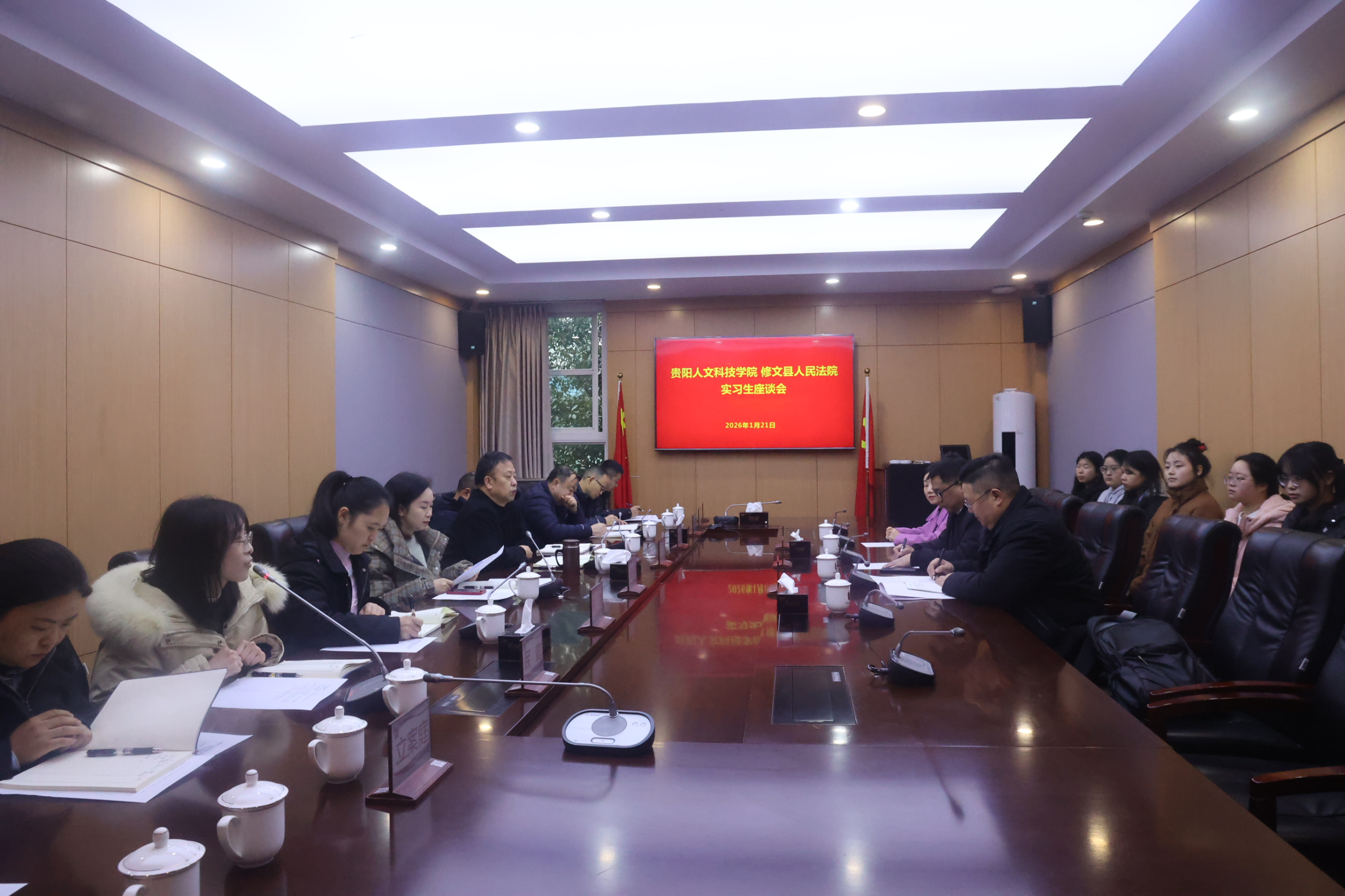 1月21日上午,开云kaiyun官方网站与修文县人民法院在修文县县法院审判大楼B区303会议室联合举办实习生座谈会,双方围绕实习生培养、院校合作与法治人才队伍建设展开深入交流。会议旨在总结实习经验、听取各方意见,进一步推动法学教育与司法实践深度融合。