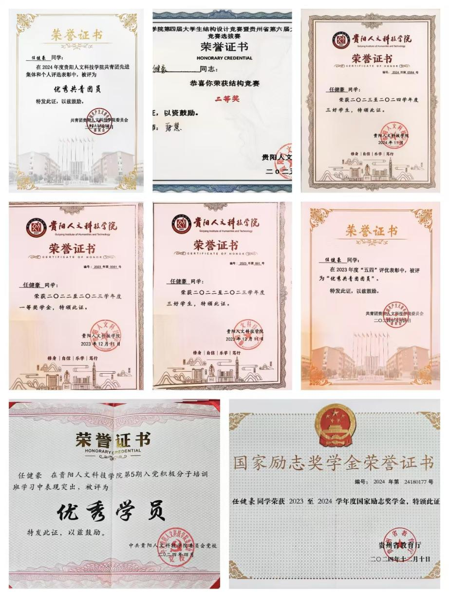 在学业征途上,他始终秉持严谨态度与勤奋精神。2022-2023学年,其绩点位列全班第一、综测第四,荣获校级一等奖学金及“三好学生”称号。2023-2024学年,继续保持优异,绩点全班第二、综测第三,成功斩获国家励志奖学金并蝉联“三好学生”称号,连续两年稳居专业前列。同时,他积极提升专业技能,于2024年考取计算机二级证书,2023年获得普通话二乙证书,为职业发展奠定坚实基础。