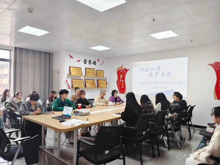 11月13日,我院于师德楼710会议室举行“研途相伴,筑梦启航”为主题的毕业生考研指导座谈会。旨在帮助2026届考研学生明确备考方向、调整心态、提升复习效率。学院党委书记田丹、学院董院长、副院长陈福娣出席会议,三位成功“上岸”的硕士研究生受邀进行经验分享。