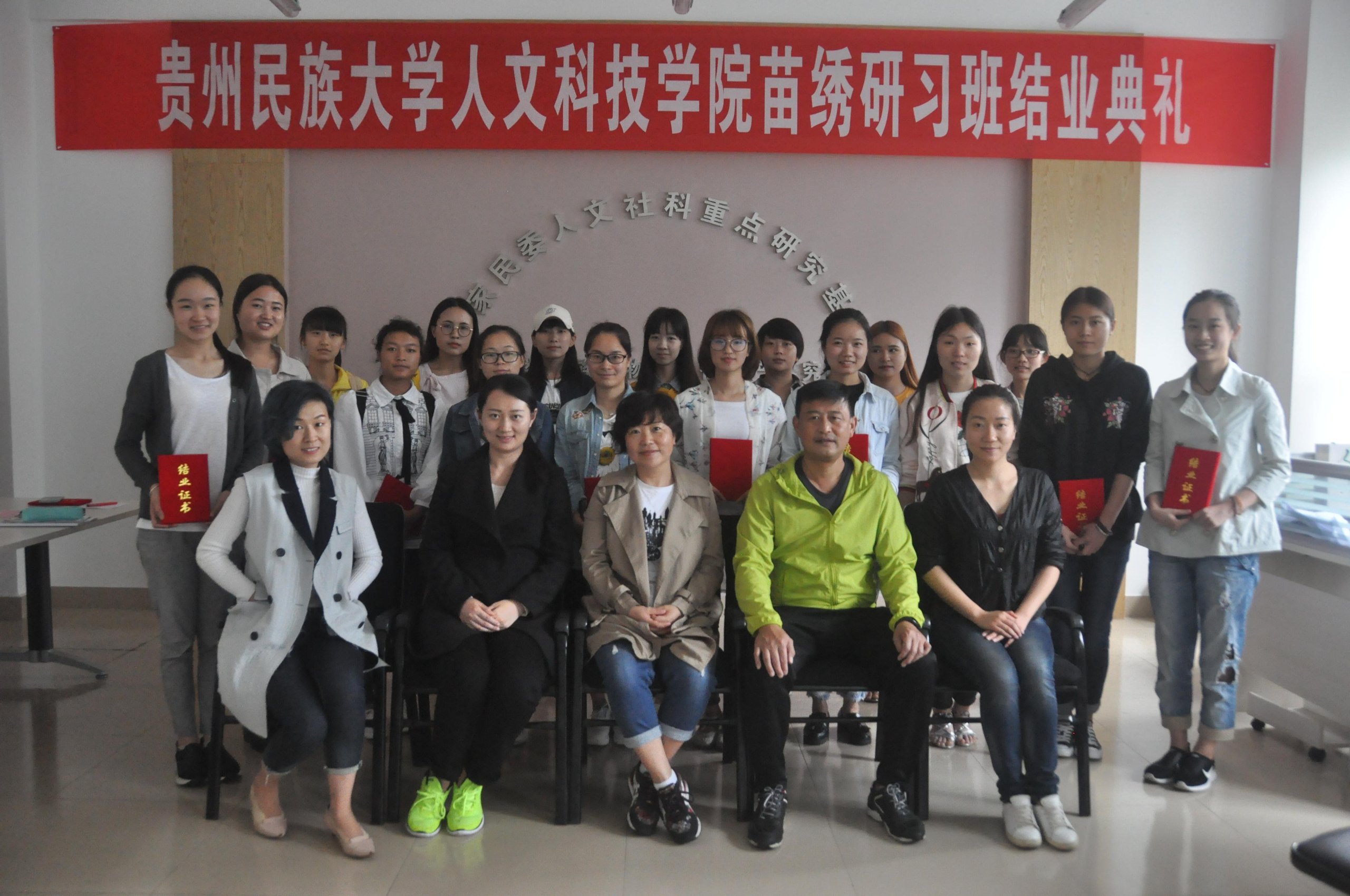 (摄影 谭明芝)2017年6月30日下午两点,由南方少数民族非物质文化遗产研究基地和我院文化产业发展研究中心联合开办的苗绣研习班(第三期)结业典礼在1A202举行。出席此次典礼的领导及老师有学院黄玮副院长;学院副院长、文化产业发展研究中心主任左丹;贵州民族大学人文科技学院科研处副处长、文化产业发展研究中心副主任余刚以及文化产业发展研究中心干事、苗绣研习班班主任及助理指导教师赵尔文达;苗绣研习班设计课指导教师袁飞。参加此次苗绣研习班结业典礼的还有第三期苗绣班的初、中、高级班的二十余位学员。
