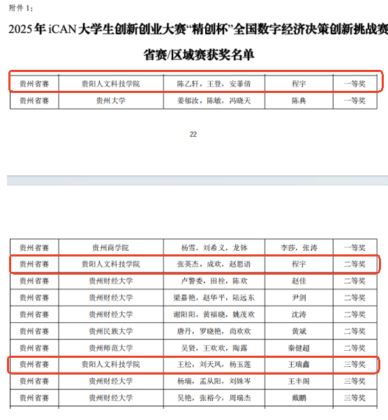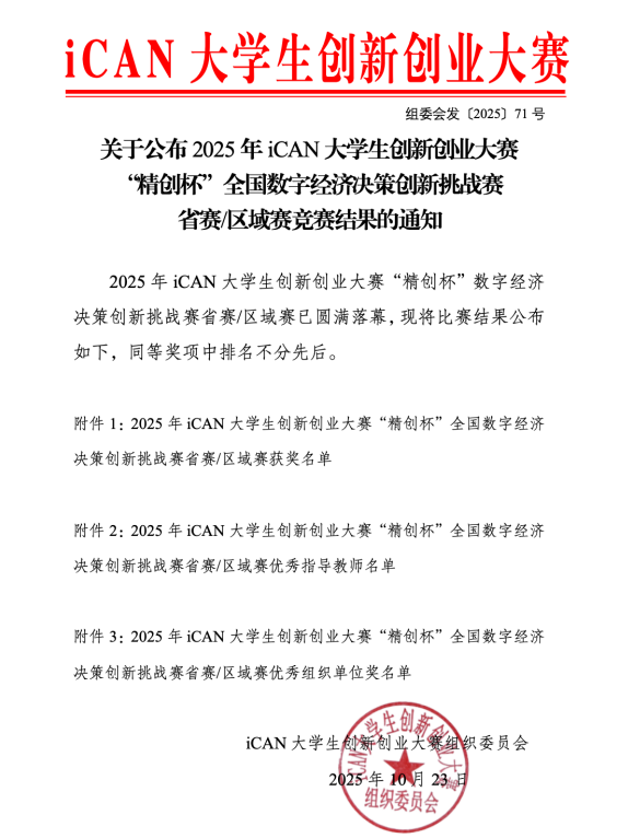 2025年10月23日,iCAN大学生创新创业大赛组委会公布了2025年iCAN大学生创新创业大赛“精创杯”全国数字经济决策创新挑战赛省赛竞赛结果。
