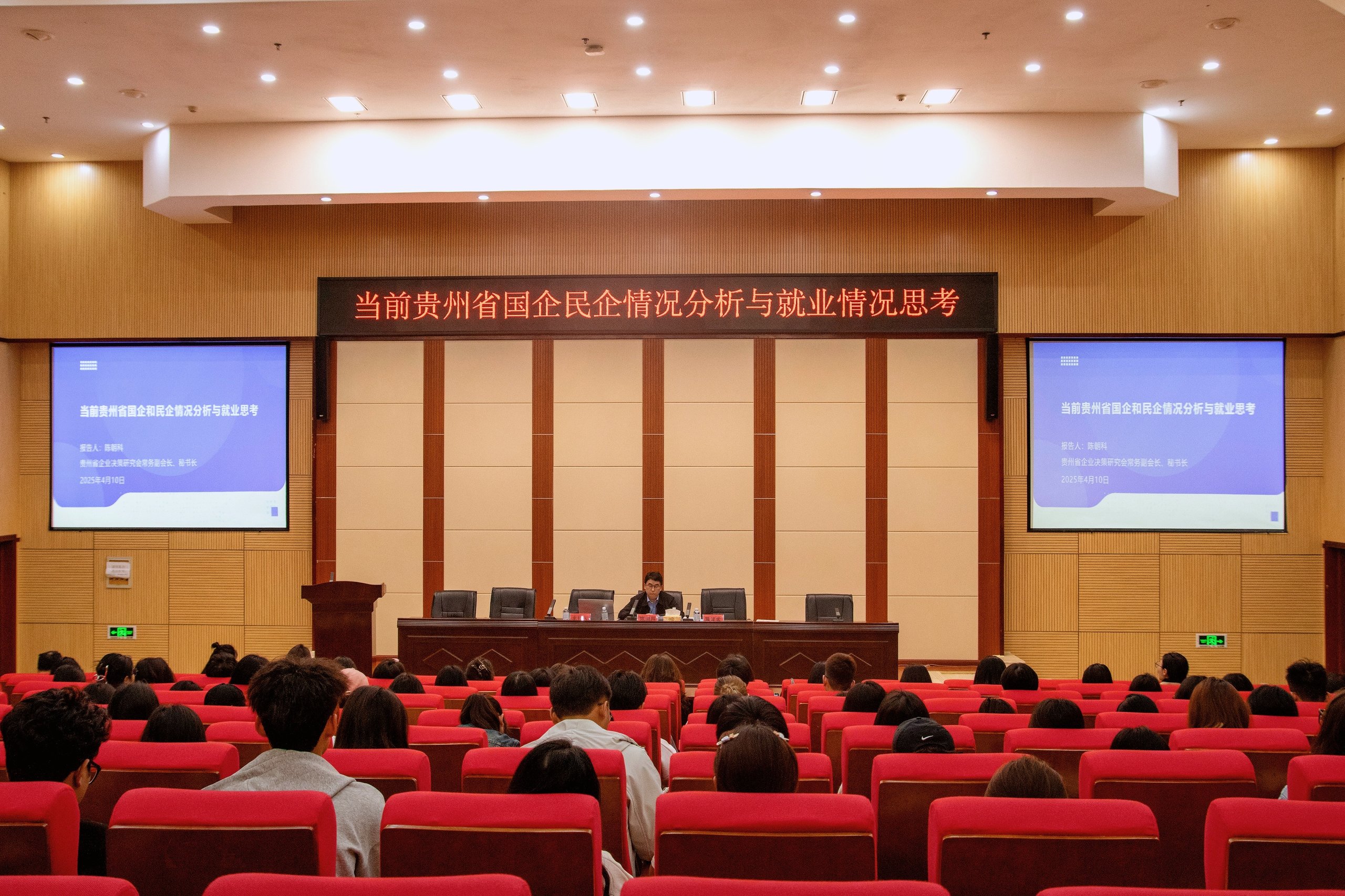 第一阶段,由陈朝科常务副会长、秘书长以《当前贵州省国企民企情况分析与就业情况思考》为题,从六个维度深入剖析了贵州省企业的发展现状与未来趋势。他聚焦贵州企业现状,为老师提供实践性、前沿性、研究性的教学案例,为学生分析未来的就业方向。一是介绍了贵州国企民企的整体发展情况,结合具体案例,解读了贵州国企民企的发展特点与挑战。二是从企业产业升级与技能需求的角度切入,为与会学生分析在贵州就业的形势与机遇,并提出了切实可行的建议。例如:建议学生在踏入工作岗位之后,需要怀着一种虚心的学习态度、对待工作要一丝不苟、执着追求;强调要结合地方经济特色,提升自身竞争力。