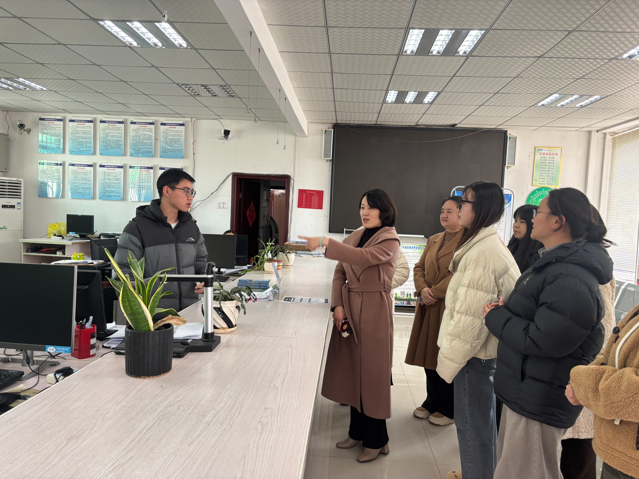 老师们深入学生工作岗位,实地察看办公环境,与学生面对面亲切交谈,详细了解大家的实习工作状态、岗位履职情况及生活近况,并结合基层工作特点,对同学们提出殷殷嘱托。