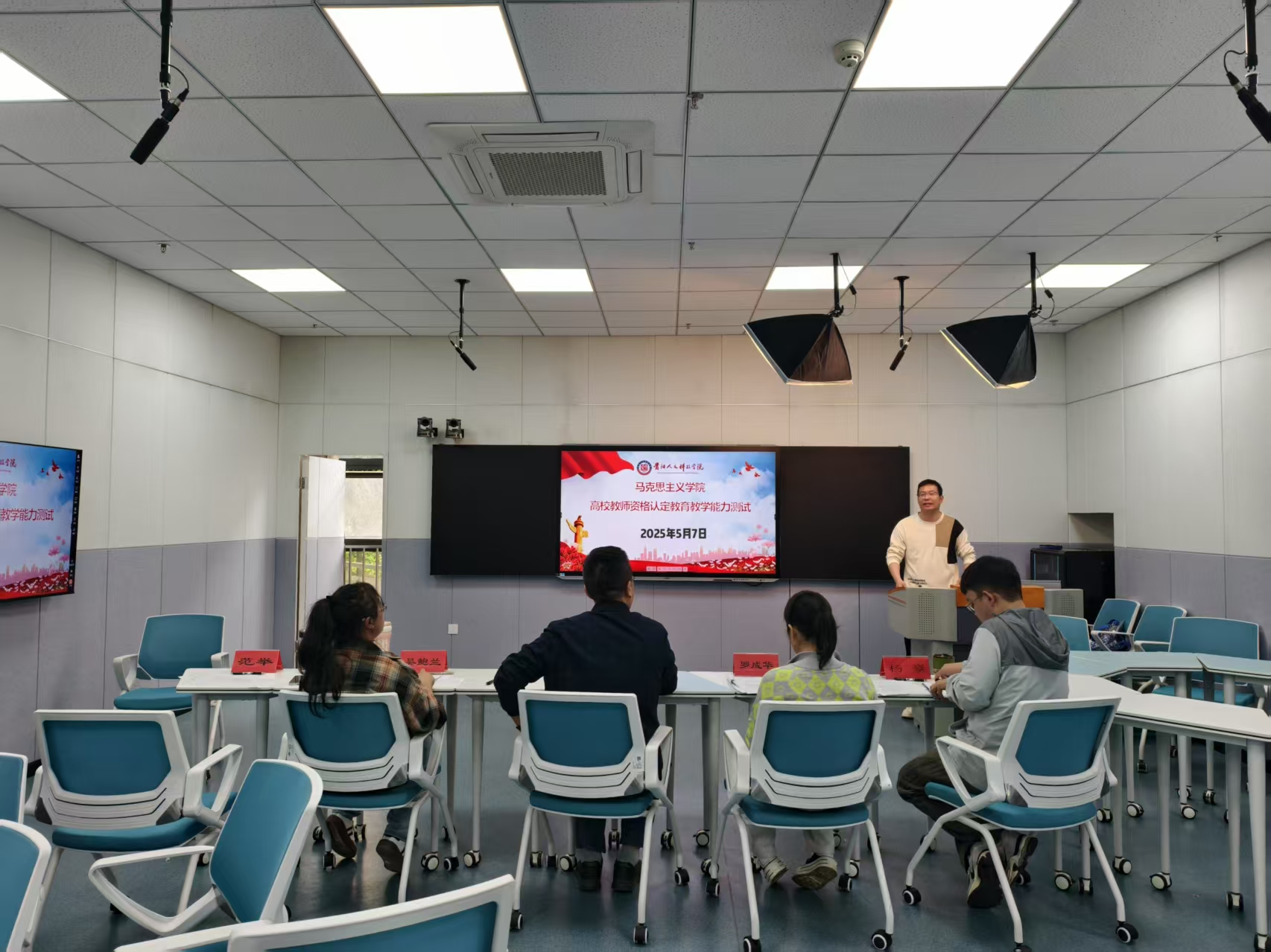 为全面落实新时代高校教师队伍建设要求,提升教育教学质量,5月7日,我院在师德楼201智慧教室组织开展了2025年高校教资教育教学能力认定考核工作。此次试讲活动由范举副主任主持,邀请院领导周剑云院长、罗成华副院长、办公室副主任范举、中华民族共同体概论教研室主任杨豪、马克思主义基本原理教研室主任吴鲍兰担任评委专家,5名申请符合高等学校教师资格认定条件的教师进行试讲。