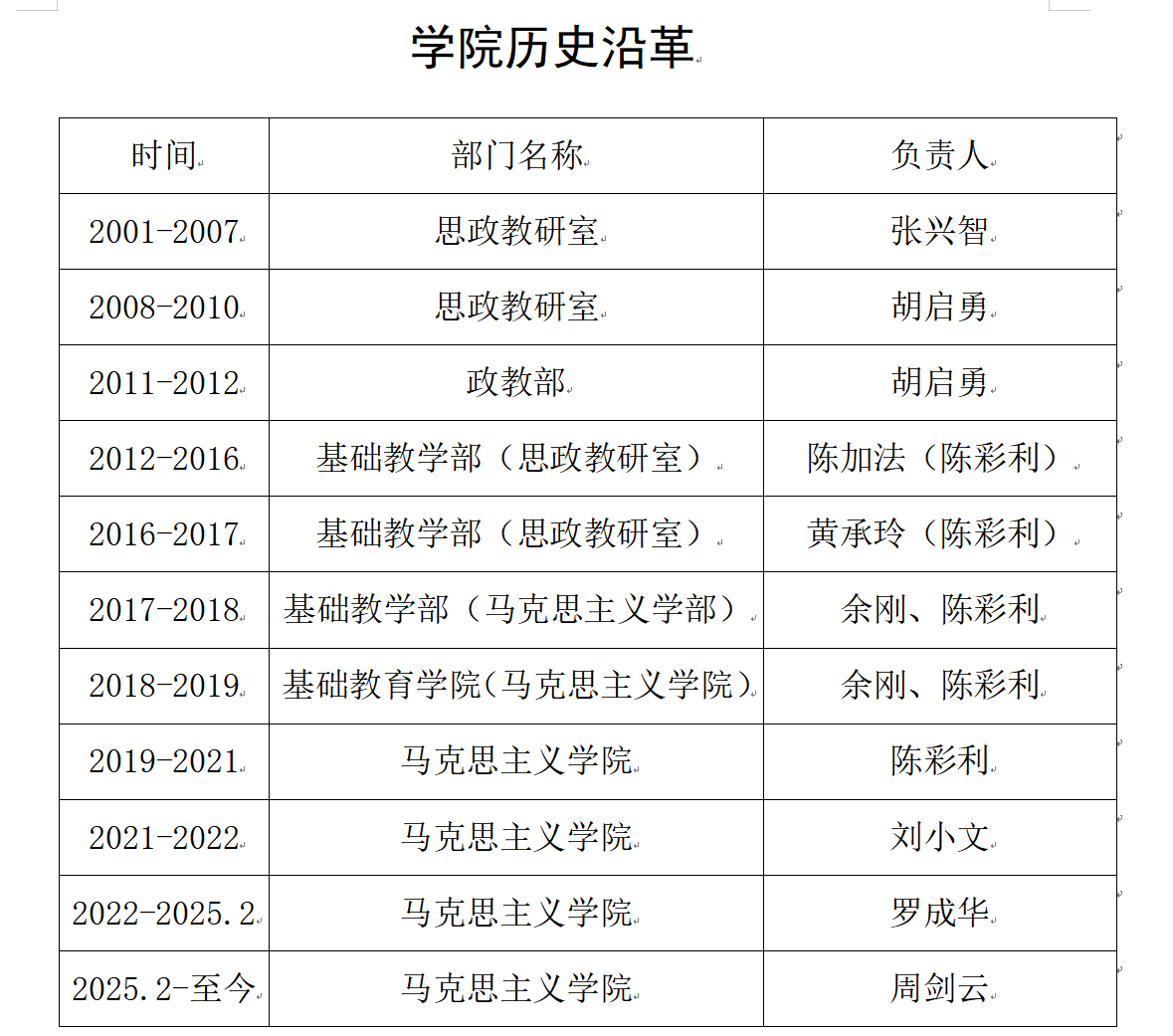开云kaiyun官方网站马克思主义学院正式成立于2018年,前身为2001年的“思政教研室”。2011年成立“政教部”,为独立的二级教学单位。2012年4月,因学校改革,其与大学语文、大学英语、大学体育、大学计算机教研室合并为“基础教学部”,主要负责全校的思政课教学。2017年11月,成立“马克思主义学部”,归属于“基础教学部”管理。2018年6月,“马克思主义学部”更名为“马克思主义学院”,归属于更名后的“基础教育学院”管理。2019年5月,经学校党政联席会议通过,撤销“基础教育学院”,“马克思主义学院”正式独立,成为承担全校思政课教学的二级教学单位。由此,学院的发展进入新的历史时期。