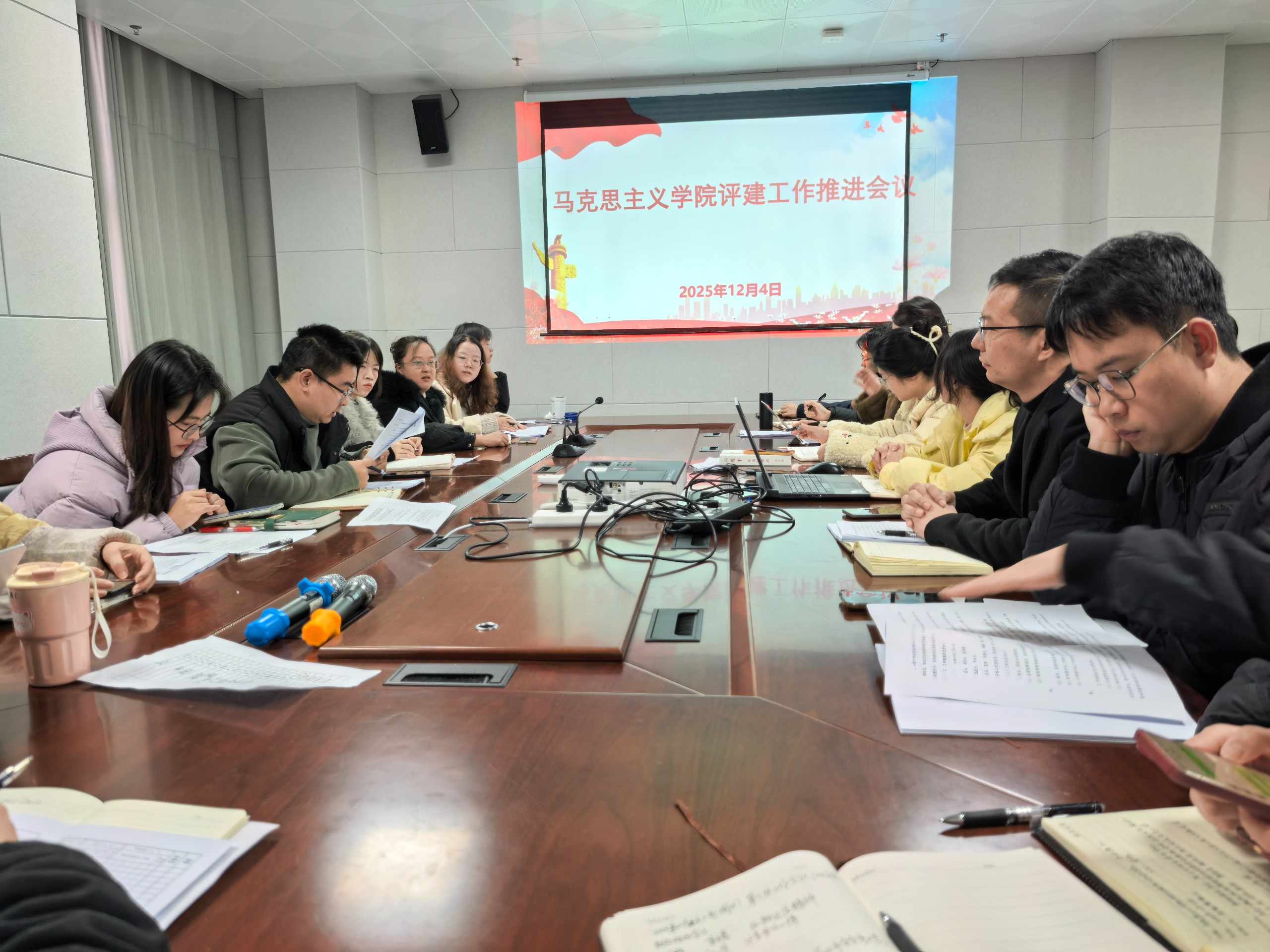 为全面推进学院迎评促建各项工作,切实将“以评促建、以评促改、以评促管”要求落到实处,12月3日,学院召开党政联席会审议通过本科教学评估迎评工作方案。12月4日上午,马克思主义学院在师德楼会议室召开本科教学评估工作推进会,对方案落地实施作出具体部署。学院领导班子成员、各教研室主任及全体教学人员参加会议,受周剑云院长委托,会议由学院党总支副书记唐林鹏主持。