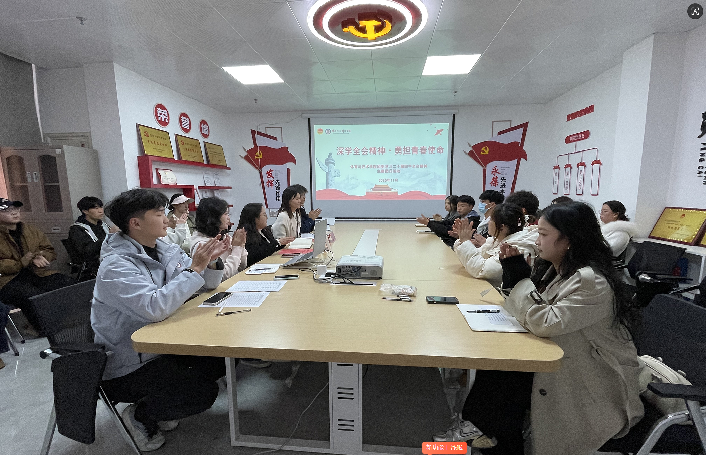 与此同时,体育与艺术学院团委全面部署,各班团支部书记参与学习后,在支部同步开展“学习党的二十届四中全会精神”主题团日活动。由各班团支书领学,并组织班上同学深入思考,将全会精神与自身成长紧密结合,分享的感悟既贴合理论内涵又充满青春温度。活动在支部内形成了浓厚的学习热潮。