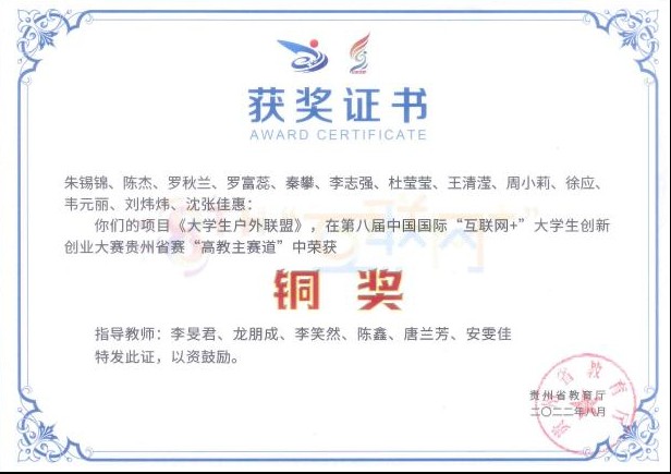 2022年8月,在第八届中国国际“互联网+”大学生创新创业大赛中,朱锡锦团队凭借《大学生户外联盟》项目在贵州省赛“高教主赛道”中荣获铜奖;2020级休闲体育专业学生杨龙的团队凭借《零计划—尚可雪莲果汁》项目斩获银奖。