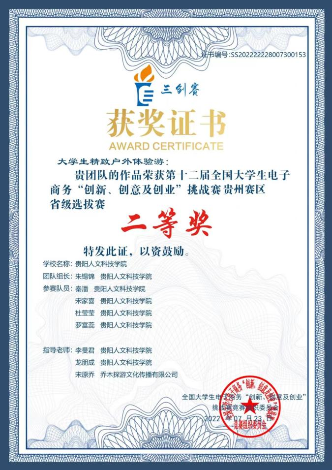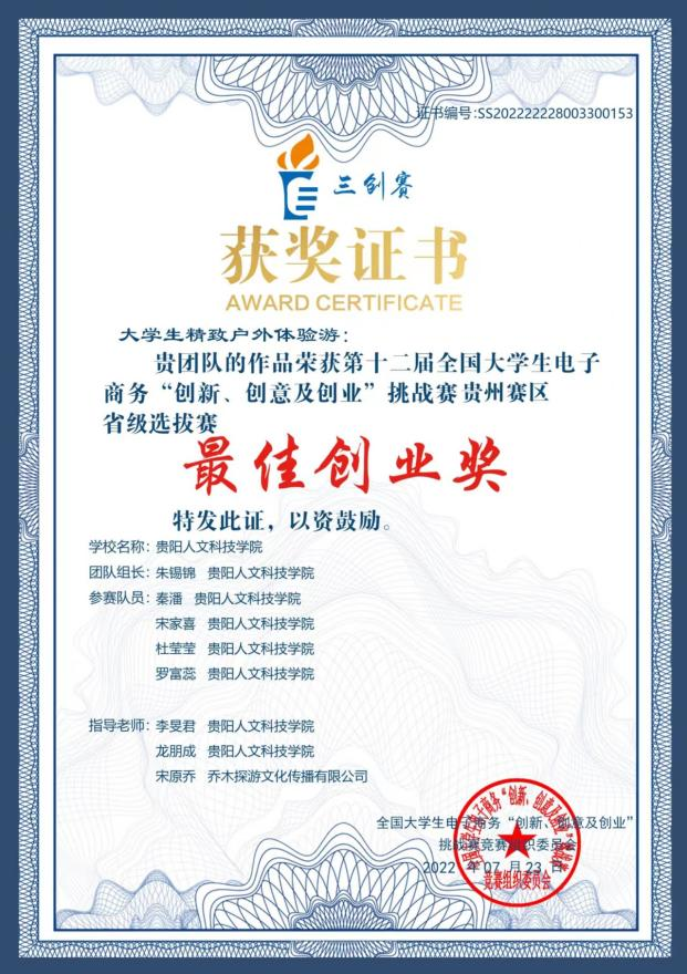 2022年6月,第十二届全国大学生电子商务“创新、创意及创业”挑战赛贵州赛区省级在开云官网大学城校区举行,我院2019级休闲体育专业学子朱锡锦团队凭借《大学生精致户外游》项目获省级赛二等奖、最佳创业奖。