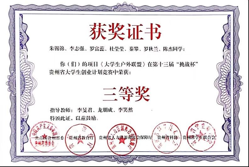 2022年8月,朱锡锦的团队又凭借《大学生户外联盟》项目在第十三届“挑战杯”贵州省大学生创业计划竞赛中获三等奖;2020级休闲体育专业学子杨龙的团队凭借《零计划》项目斩获一等奖。