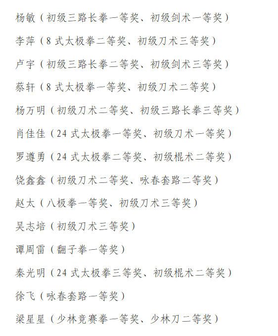 本次比赛设拳术、太极拳、器械、太极器械、对练、集体共6个大类,140多个小项,涵盖各类传统武术流派、竞赛推广套路和创编优秀套路。其中我院体育教育专业武术专项学子共14人参加的项目有少林拳、少林刀、翻子拳、八极拳、咏春套路、初级棍术、24式太极拳、初级剑术、初级长拳三路、初级刀术和8式太极拳。