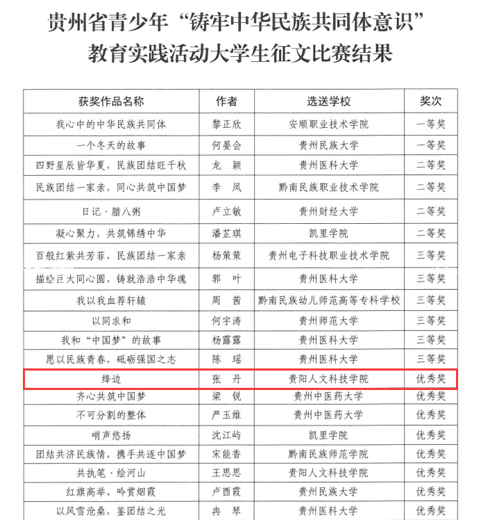 2022年4月3日,由省民宗委、省教育厅、团省委共同举办的贵州省青少年“铸牢中华民族共同体意识”教育实践活动大学生征文演讲比赛结果公布。我院2020级动画专业1班学生张丹在本次征文比赛中凭借作品《绛边》荣获了优秀奖。