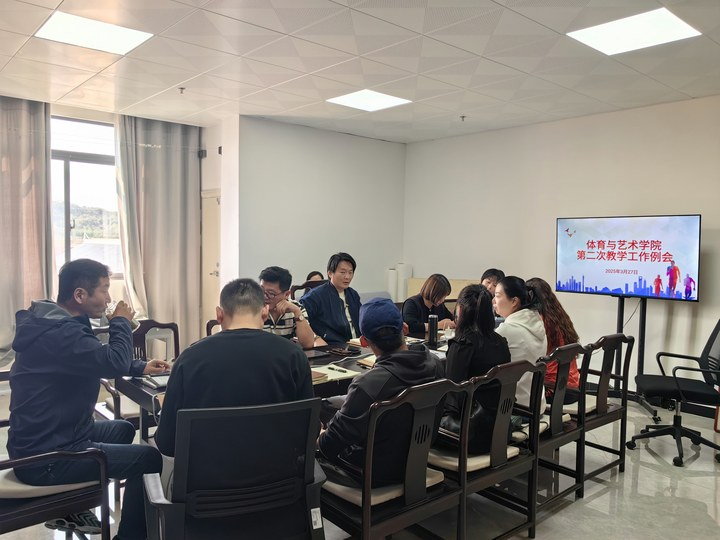 2025年3月27日,体育与艺术学院在师德楼1010方舟工作室召开本年度第二次教学工作例会。会议由学院院长王雪主持,学院党委书记张健出席本次会议,学院副院长、各教研室主任及副主任、教学秘书、行政人员等共同参会。