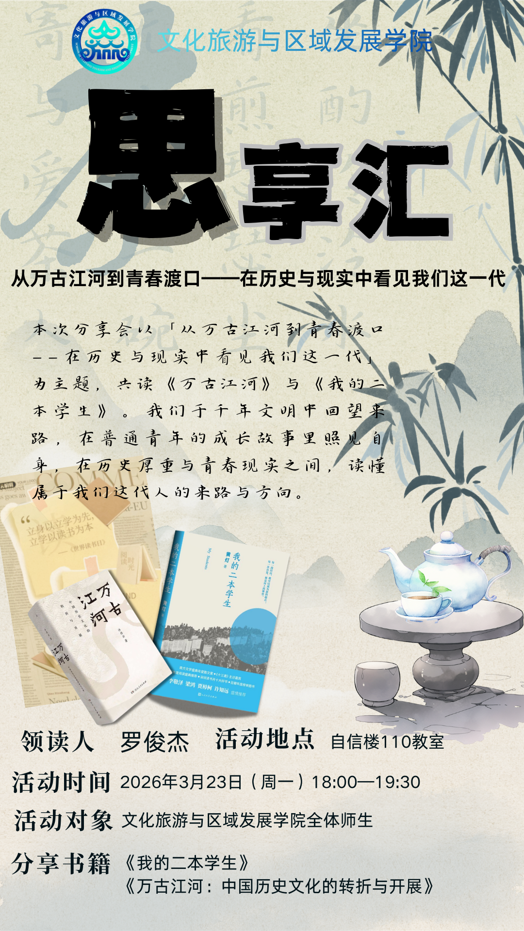文化旅游与区域发展学院“思享汇”温暖再启,本期我们将以“从万古江河到青春渡口——在历史与现实中看见我们这一代”为主题,在书页间回望文明脉络,在故事中照见青春方向。