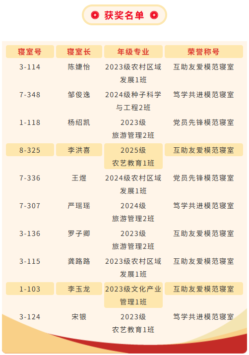经过评委组细致考察、综合打分与集中研讨。本次“模范寝室”评选获奖名单如下:
