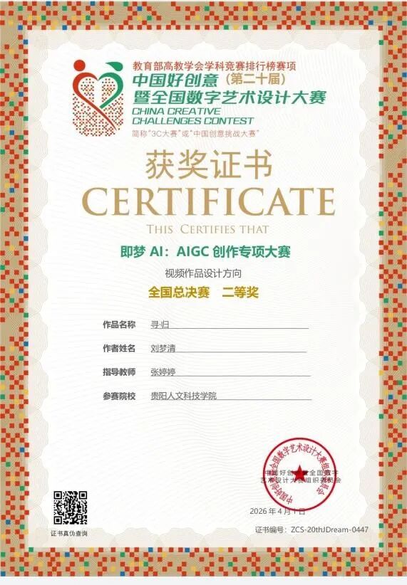 4月1日,第二十届中国好创意暨全国数字艺术设计大赛获奖结果正式公布。我院 2025 级广播电视编导专业学生刘梦清凭借 AIGC 视频作品《寻·归》,斩获即梦AI:AIGC 创作专项大赛视频作品设计方向全国总决赛二等奖,同时获得即梦校园 AIGC 创作者认证。该作品指导教师新闻教研室张婷婷,荣获本次大赛全国总决赛优秀指导教师奖。