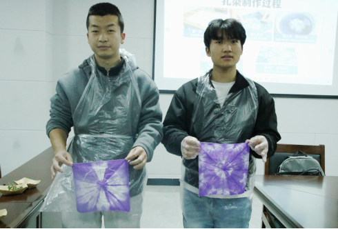 项目小组首先介绍扎染的非遗文化背景、天然植物染色的环保优势与桑葚扎染的工艺特点,现场演示捆扎、夹染、折叠染等基础技法,科普染液使用与固色的技巧,示范冰箱贴、发圈等小物件的制作步骤,零基础的同学们很快就掌握扎染入门要领。