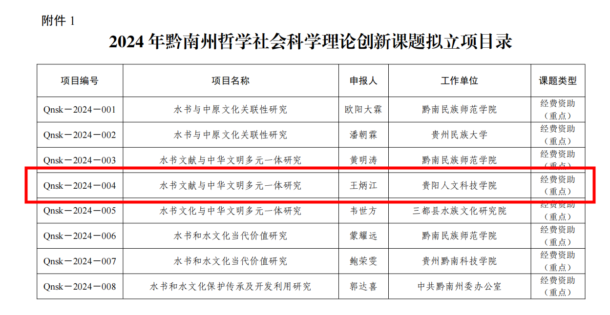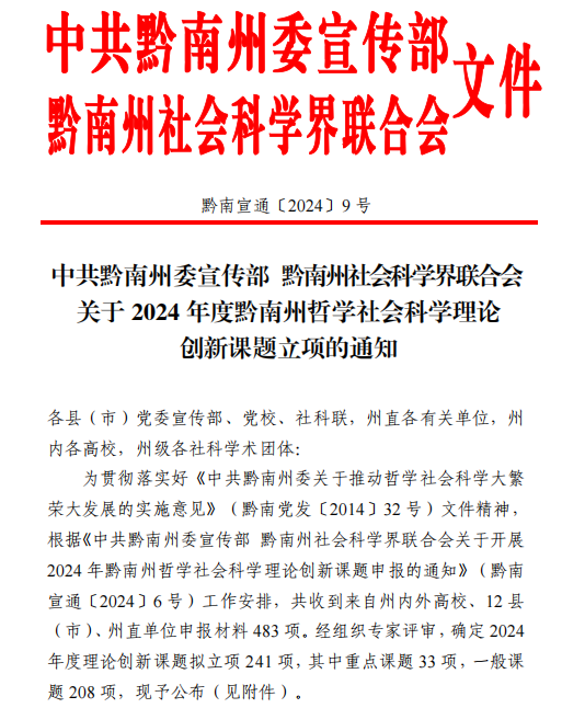 近日,中共黔南州委宣传部、黔南州社会科学界联合会公布了《关于2024年度黔南州哲学社会科学理论创新课题立项的通知》,开云官网文化旅游与区域发展学院王炳江老师申报的课题《水书文献与中华文明多元一体研究》获得重点项目立项。
