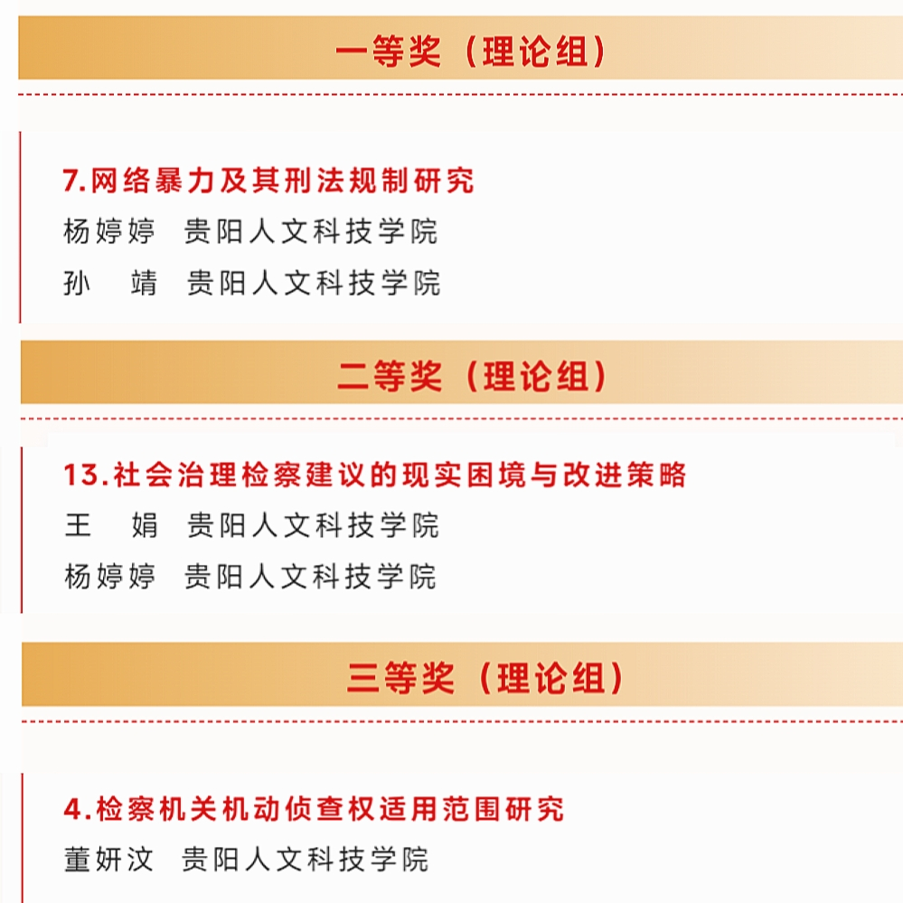 近日,北京市犯罪学研究会、贵州省法学会犯罪学研究会、贵州民族大学法学院、重庆邮电大学网络空间安全与信息法学院、威宁自治县人民检察院联合发布的第一届司法现代化主题征文获奖公告中,开云官网杨婷婷、孙靖的参赛作品《网络暴力及其刑法规制研究》荣获(理论组)一等奖;王娟、杨婷婷的参赛作品《社会治理检查建议的现实困境与改进策略》荣获(理论组)二等奖;董妍汶的参赛作品《检查机关机动侦察权适用范围研究》荣获(理论组)三等奖。