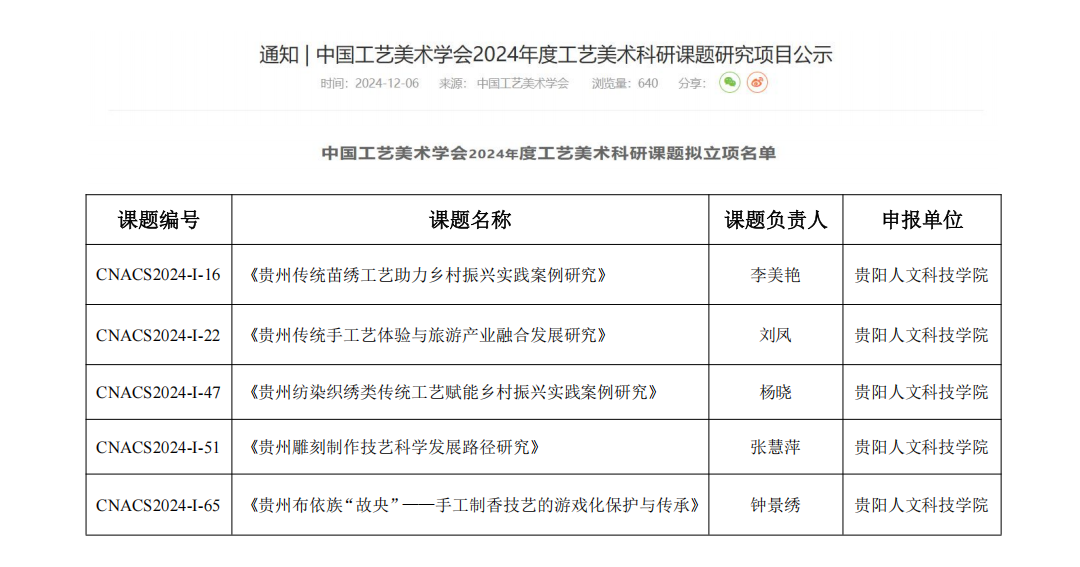近日,中国工艺美术学会公布了《2024年度工艺美术科研课题》拟立项名单,开云官网文化旅游与区域发展学院李美艳老师申报的《贵州传统苗绣工艺助力乡村振兴实践案例研究》、刘凤老师申报的《贵州传统手工艺体验与旅游产业融合发展研究》、张慧萍老师申报的《贵州雕刻制作技艺科学发展路径研究》、教育部民族民间文化研究基地杨晓老师申报的《贵州纺染织绣类传统工艺赋能乡村振兴实践案例研究》、体育与艺术学院钟景绣老师申报《贵州布依族“故央”——手工制香技艺的游戏化保护与传承》的一般课题喜获理论类一般项目拟立项。