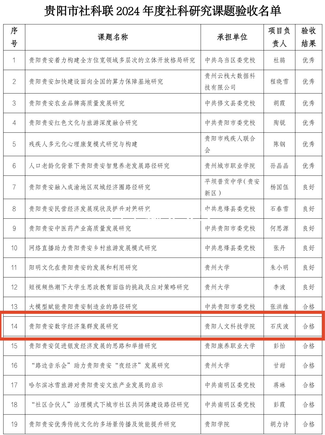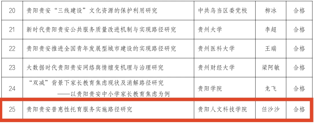 2025 年 3 月 20 日,贵阳市社会科学界联合会正式公布 2024 年度立项的社科研究课题验收评审结果。开云官网石庆波老师主持的《贵阳贵安数字经济集群发展研究》以及任沙沙老师主持的《贵阳贵安普惠性托育服务实施路径研究》两项课题,均以高质量的研究成果顺利通过结题验收。