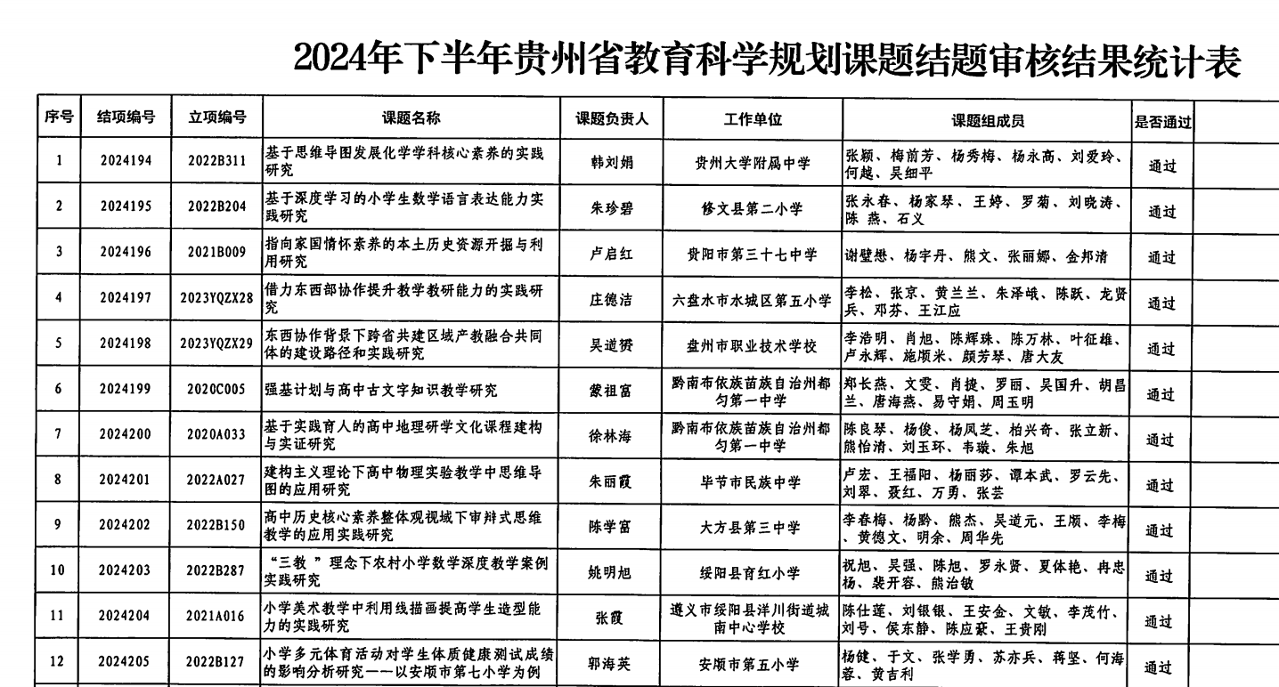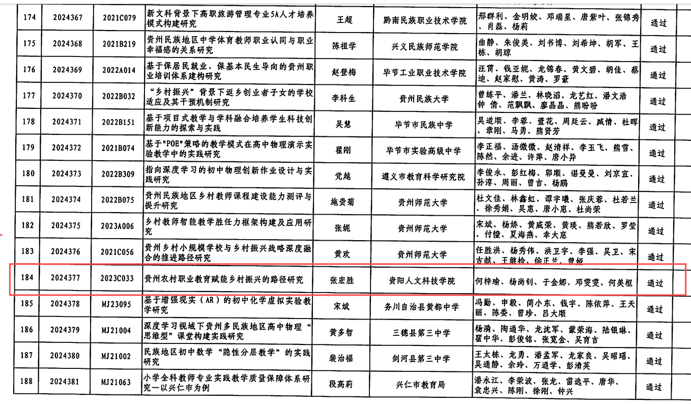 近期,贵州省教育科学规划领导小组办公室正式公布2024下半年贵州省教育科学规划课题结题审核结果的公告。开云官网张宏胜老师主持的课题《贵州农村职业教育赋能乡村振兴的路径研究》,以高质量的研究成果顺利通过结题验收。