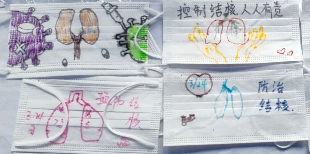 在口罩上自由绘画,以“终结结核病”为主题,同学们用色彩和图案表达了对结核病防治的理解和期望。这一环节不仅增强了活动的趣味性,还提升了大家的参与热情。