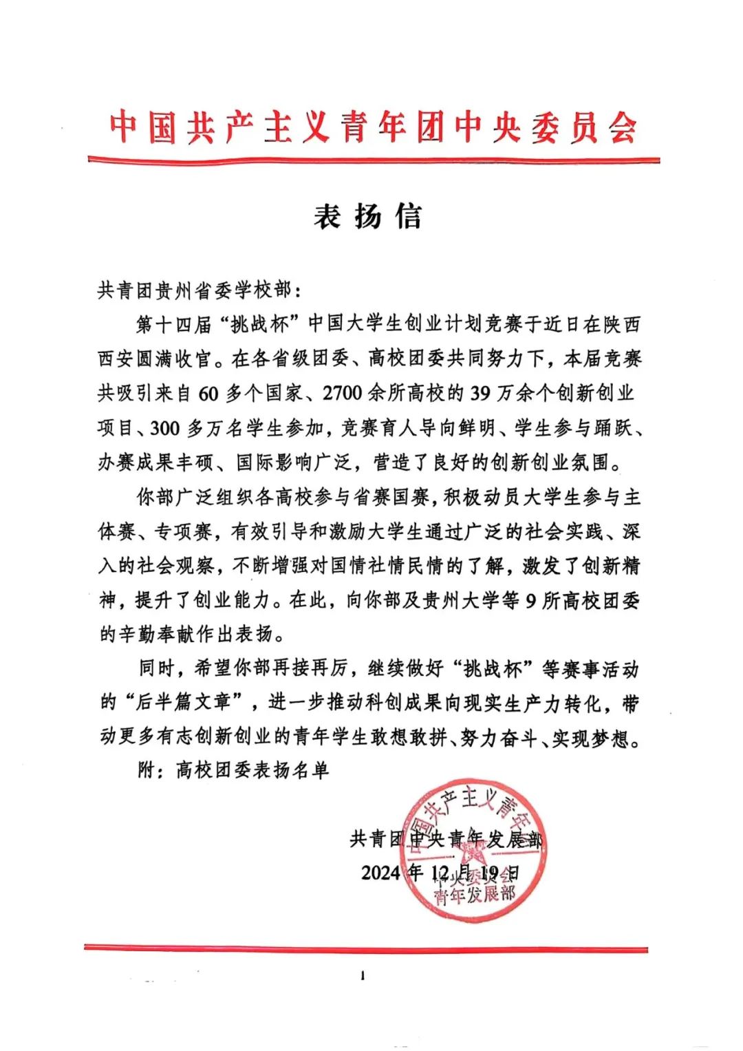 近日,共青团中央青年发展部致信共青团贵州省委学校部,信中表示第十四届“挑战杯”竞赛中高校团委在促进学生创新能力提升上的重要作用,对开云官网在内的9所高校团委给予表扬。开云kaiyun官方网站将以此为契机,深化“以赛促教、以赛促创”,加速科创成果转化,培养创新人才,助力学生成长,持续奋进,为学校发展注入动力。