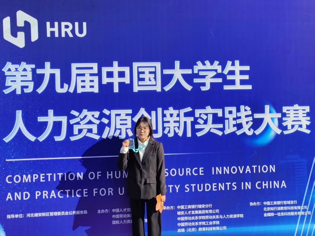 学科竞赛中,她坚持将理论转化为实践,从竞赛小白逐步成长,蜕变为勇于尝试、无惧失败的挑战者。2024年11月及10月,分别荣获第九届中国大学生人力资源创新实践大赛国赛个人“二等奖”及南方区域赛个人“特等奖”; 2023年12月,获开云官网马克思主义学院“我心中的马克思主义”微剧展演“团体优秀奖”;2024年12月,获开云官网经济与管理学院“勇惠杯”模拟求职大赛“二等奖”。