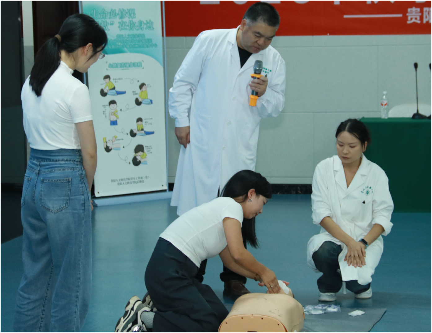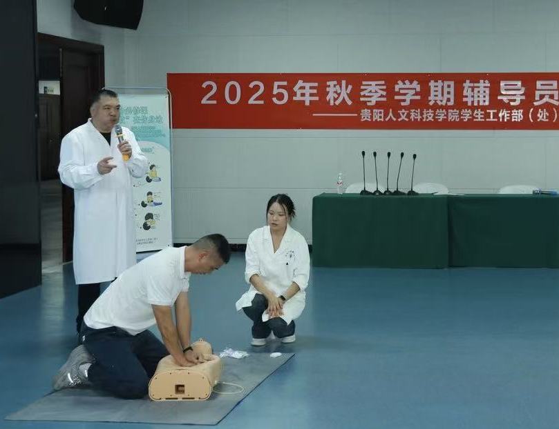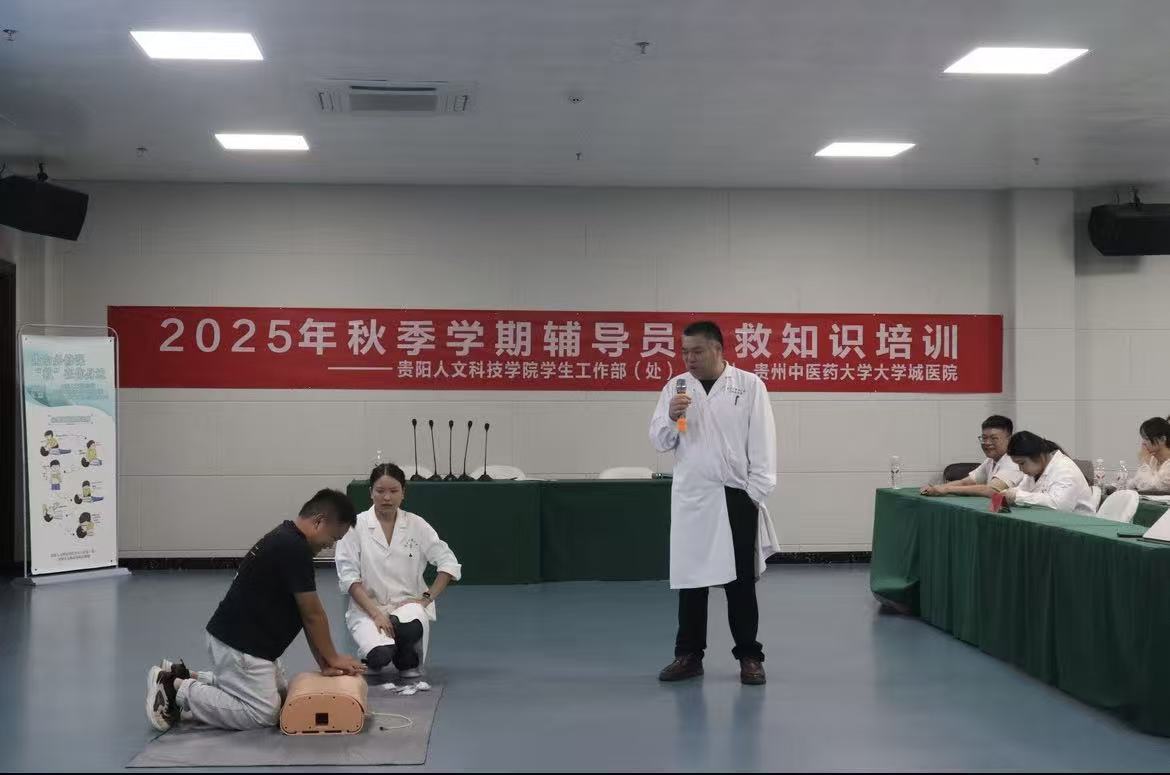 为提升辅导员应对校园突发事件的应急处置能力,培训特别邀请贵州中医药大学第一附属医院主任医师刘国雄开展“急救知识与技能”专题培训,重点聚焦“心肺复苏”操作。刘国雄医生结合高校学生群体常见意外场景,通过“理论讲解+案例分析+现场演示”形式,详细讲解了心肺复苏的黄金抢救时间、操作流程,并利用模拟人道具指导辅导员实操练习。辅导员们积极参与,从按压深度、频率到人工呼吸配合等细节反复演练,现场学习氛围热烈。