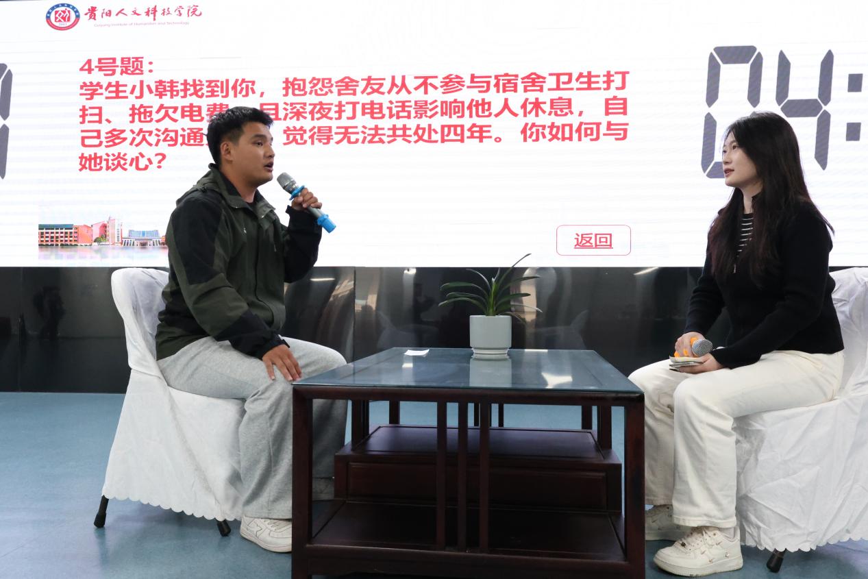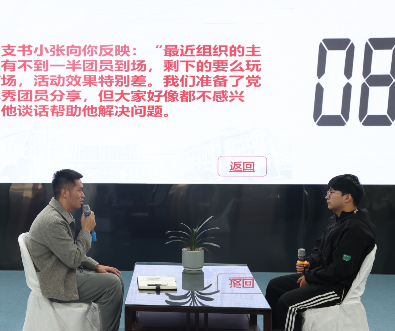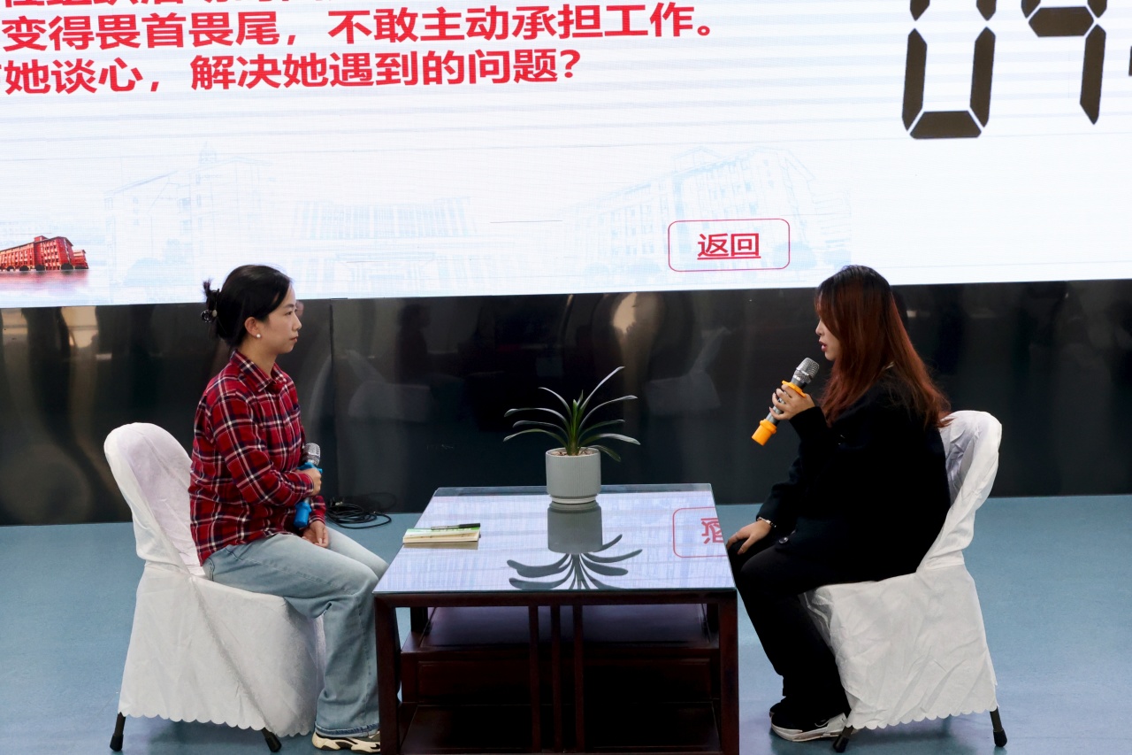 在“谈心谈话”环节。结合本次培训主题,现场设定了党团活动参与积极性不高、班级凝聚力不强、宿舍矛盾等场景,辅导员们结合工作经验,精准把脉,耐心倾听;学生演员们充分融入角色,真实展现问题场景中的情绪与困惑。谈话过程中,其余辅导员认真观看,不时低头交流彼此的思考,有效提升了应对实际工作的能力。