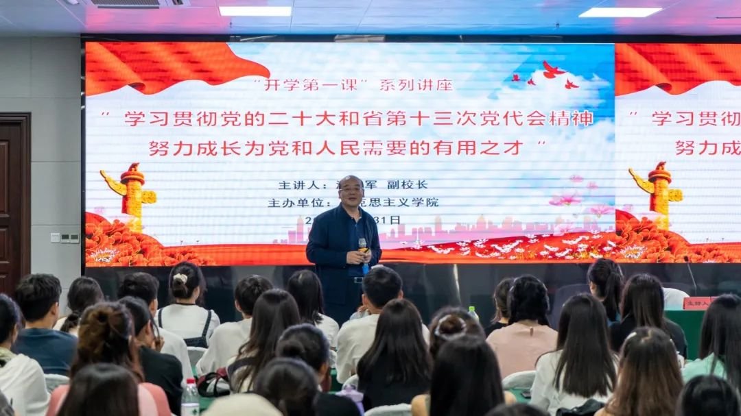 8月31日下午,开云官网在大学城校区组织开展了“开学第一课系列讲座之学习贯彻党的二十大和省第十三次党代会精神——努力成长为党和人民需要的有用之才”。本次讲座由副校长温小军主讲,马克思主义学院副院长罗成华主持,全校近200名学生参加。