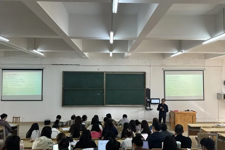 金颖若教授以“村超、村BA——新时代文化旅游与乡村振兴的创新实践”为主题,从“是什么——做什么——凭什么”展开讲解,向师生深入描绘中国式现代化的“两江”实践。他指出,中国式现代化是全体人民共同富裕的现代化,是物质文明和精神文明相协调的现代化。村超、村BA的举办,拉动了当地的经济发展,丰富了当地村民的精神生活,是中国式现代化的生动诠释。本次宣讲主题鲜明,引经据典,旁征博引,既有政治高度,又有理论深度。金颖若教授以其深厚的理论功底、形象生动的事例和风趣的语言进行讲解,现场气氛活跃,师生党员踊跃参与、积极回答。