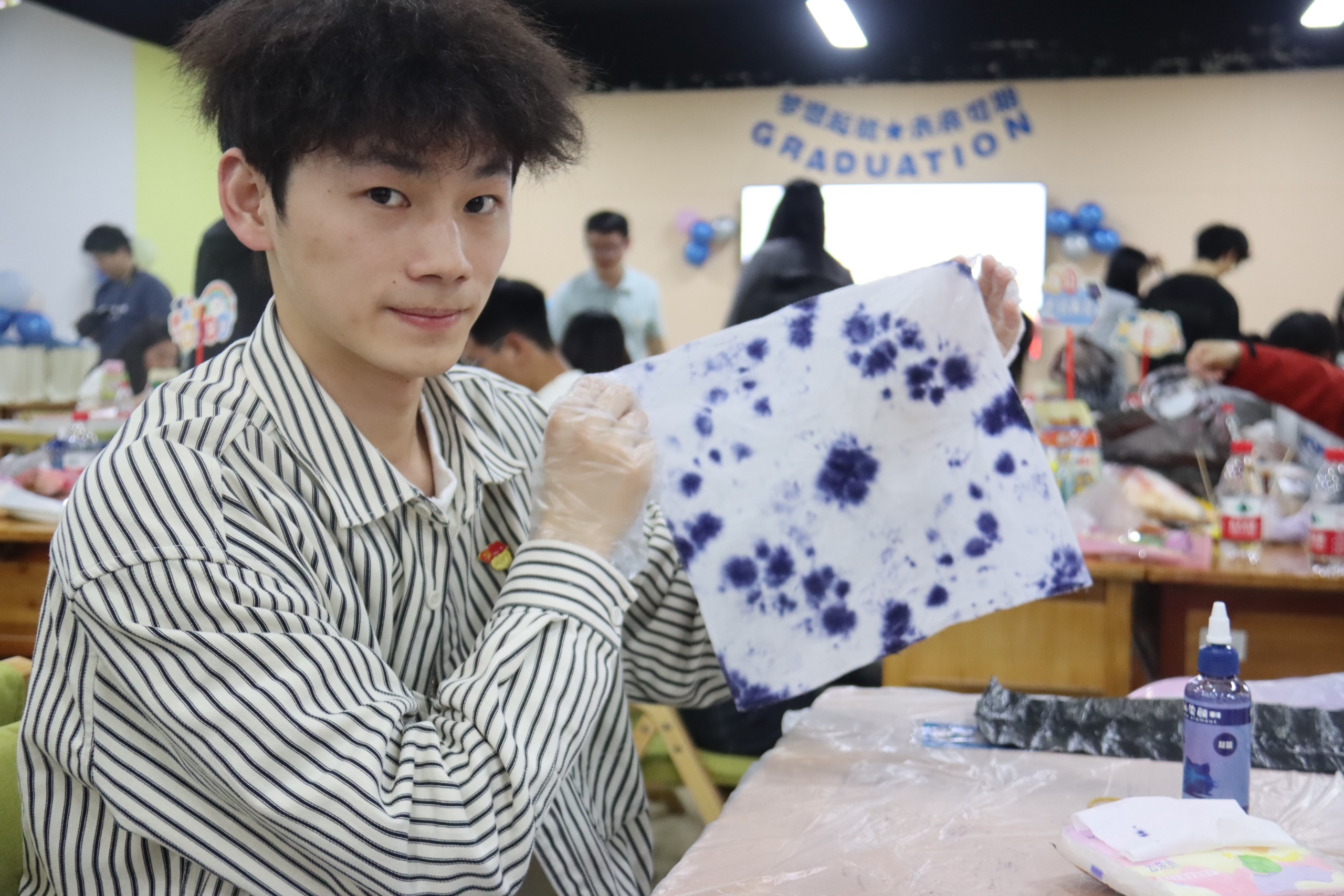 随后进行了扎染手工活动,主持人介绍扎染工艺的历史以及制作程序,让毕业生党员体验扎染过程,用方巾去描绘属于自己独特青春的颜色,毕业生党员在画布上渲染出绚丽的画卷,表达自己对未来美好的期望。