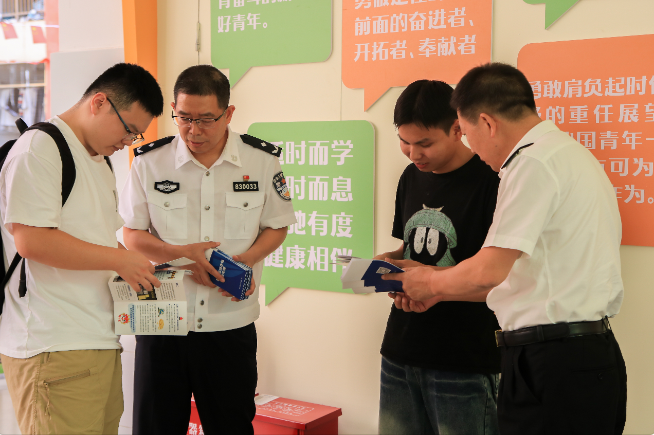 宣讲结束后,警官们并未停下普法脚步,而是走进校园、走进学生宿舍,与学子们展开“一对一”“面对面”的互动交流。警官们通过宣传册解读搭配案例强化警示,引导大家树立“主动防范、坚决抵制”的意识。同时,鼓励同学们以宿舍为单位,互相提醒、共同监督,将普法知识转化为守护自身与他人的实际行动。