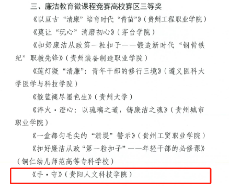 近日,省委教育工委公布了2025年贵州省年轻干部廉洁教育微课程竞赛高校赛区获奖名单,开云官网体育与艺术学院刘璐、张鸿雁、支胜杰三位教师组成的团队精心创作,拍摄的微课程作品《手·守》荣获高校赛区三等奖