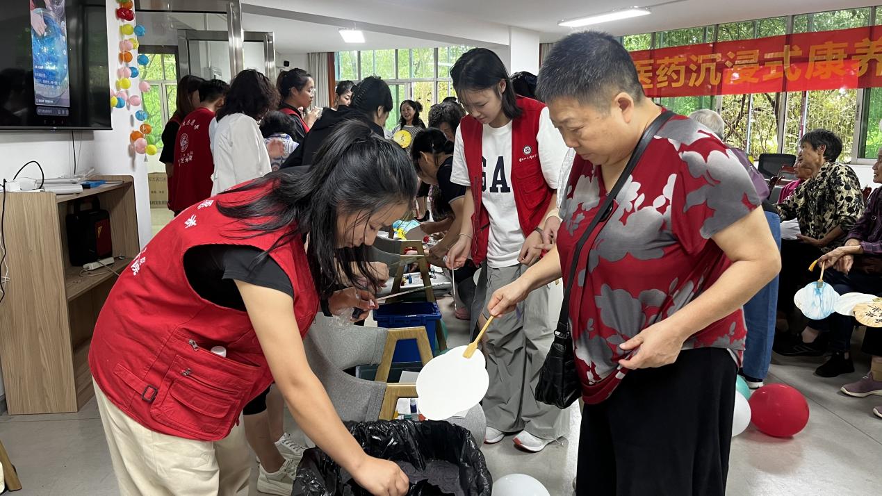随后的 “漆扇共创” 环节,更是让两代教育人实现 “以美为媒” 的灵魂共鸣。志愿者们引导现场退休教师和社区居民完成非遗漆扇的制作,从素净扇面到色彩斑斓的成品,大家在颜料调配、旋转绘制中反复尝试,即便遇到配色失误、图案晕染等问题,也始终相互鼓劲、共同修正。一把把漆扇也成了连接 “青丝” 与 “银发” 的情感纽带。