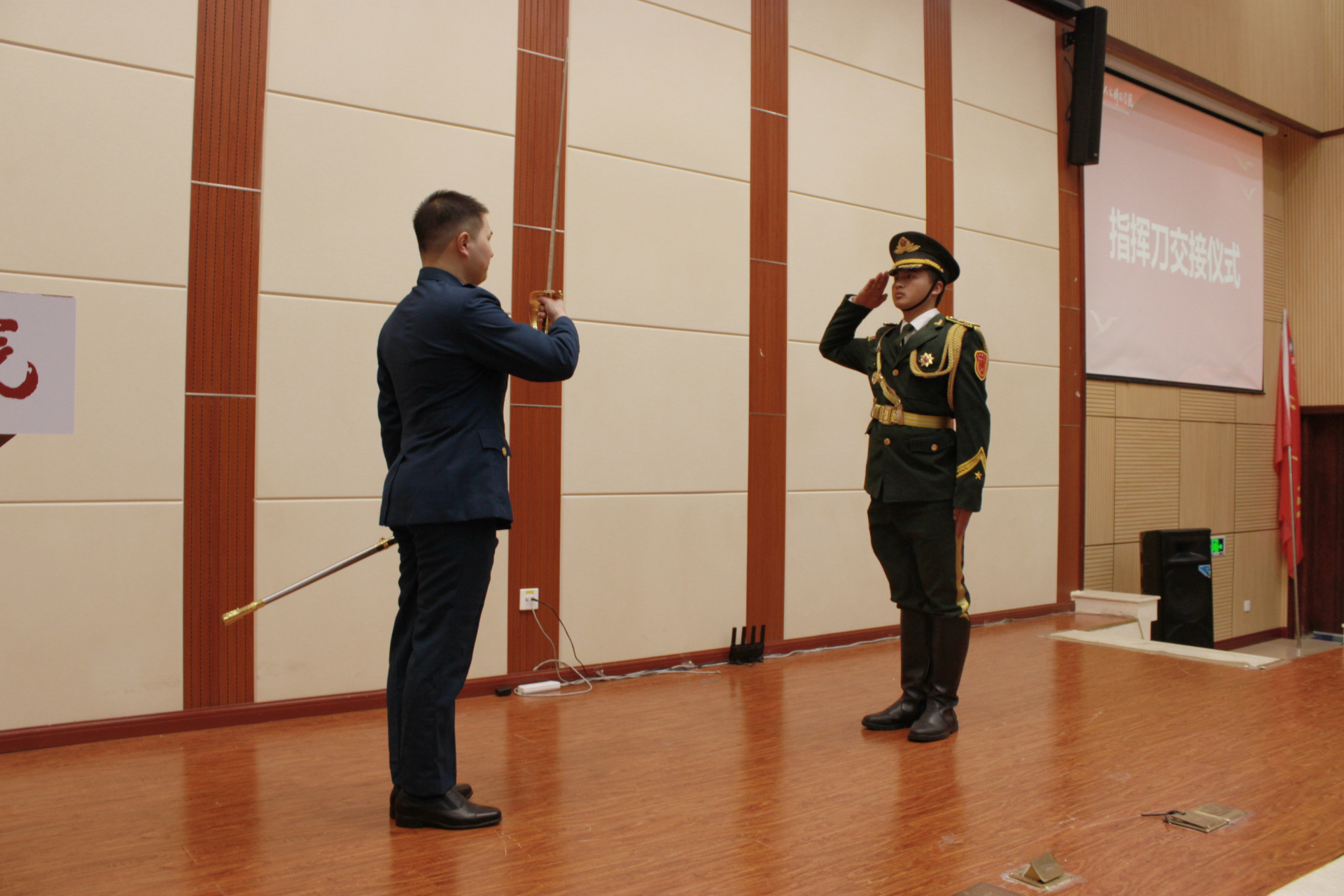 军梦团团旗与国旗护卫队指挥刀在现场庄严完成交接仪式。新老队员代表先后上台交流发言,分享成长感悟、传递责任担当。这不仅是工作任务的交接,更是军魂精神、优良传统的薪火相传,彰显出一代又一代军梦人接续奋斗的初心使命。老队员还为新队员粘贴标志服饰,新队员面向团旗庄严宣誓,尽显青春担当。