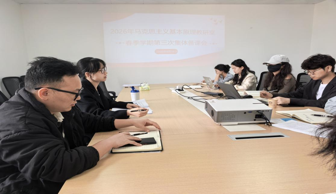 马克思主义基本原理教研室举行本学期第三次集体备课会,会议聚焦《毛泽东思想和中国特色社会主义理论体系概论》课程内容,系统分析了相关章节重难点与教学设计,与会教师围绕教学内容、学情应对等展开深入交流,进一步统一了教学口径,凝聚了育人合力。教研室副主任吴选红强调,要以集体备课为抓手,坚持守正创新,把准思政课政治方向,切实提升教学实效。